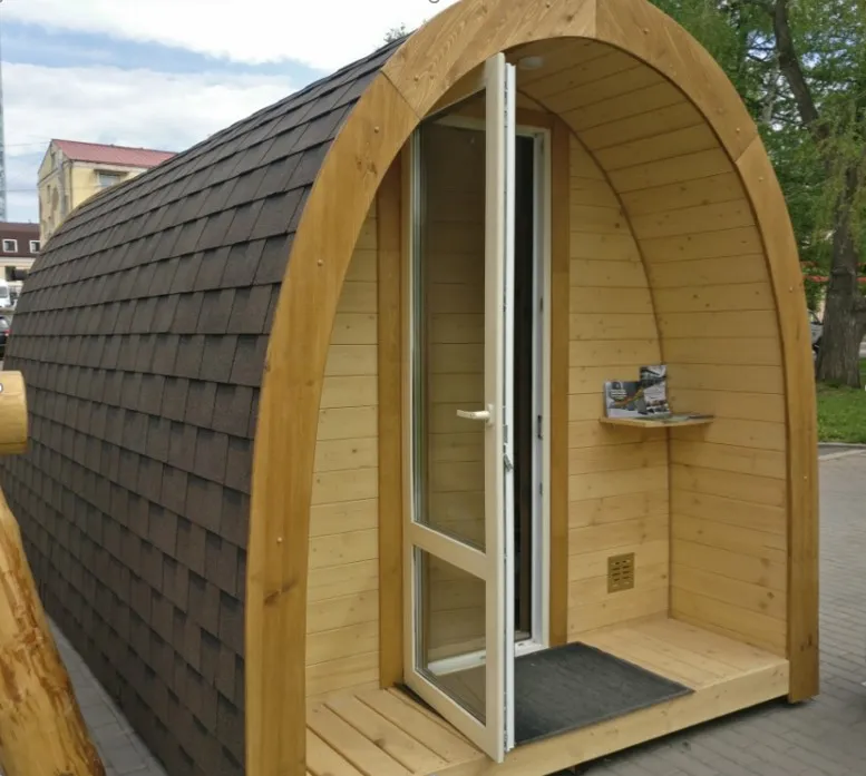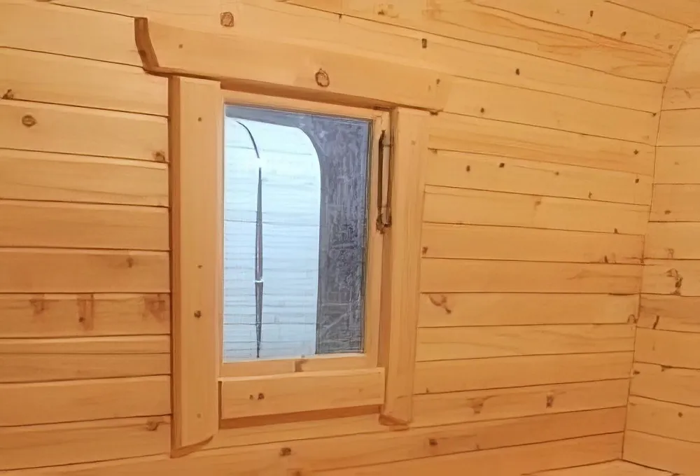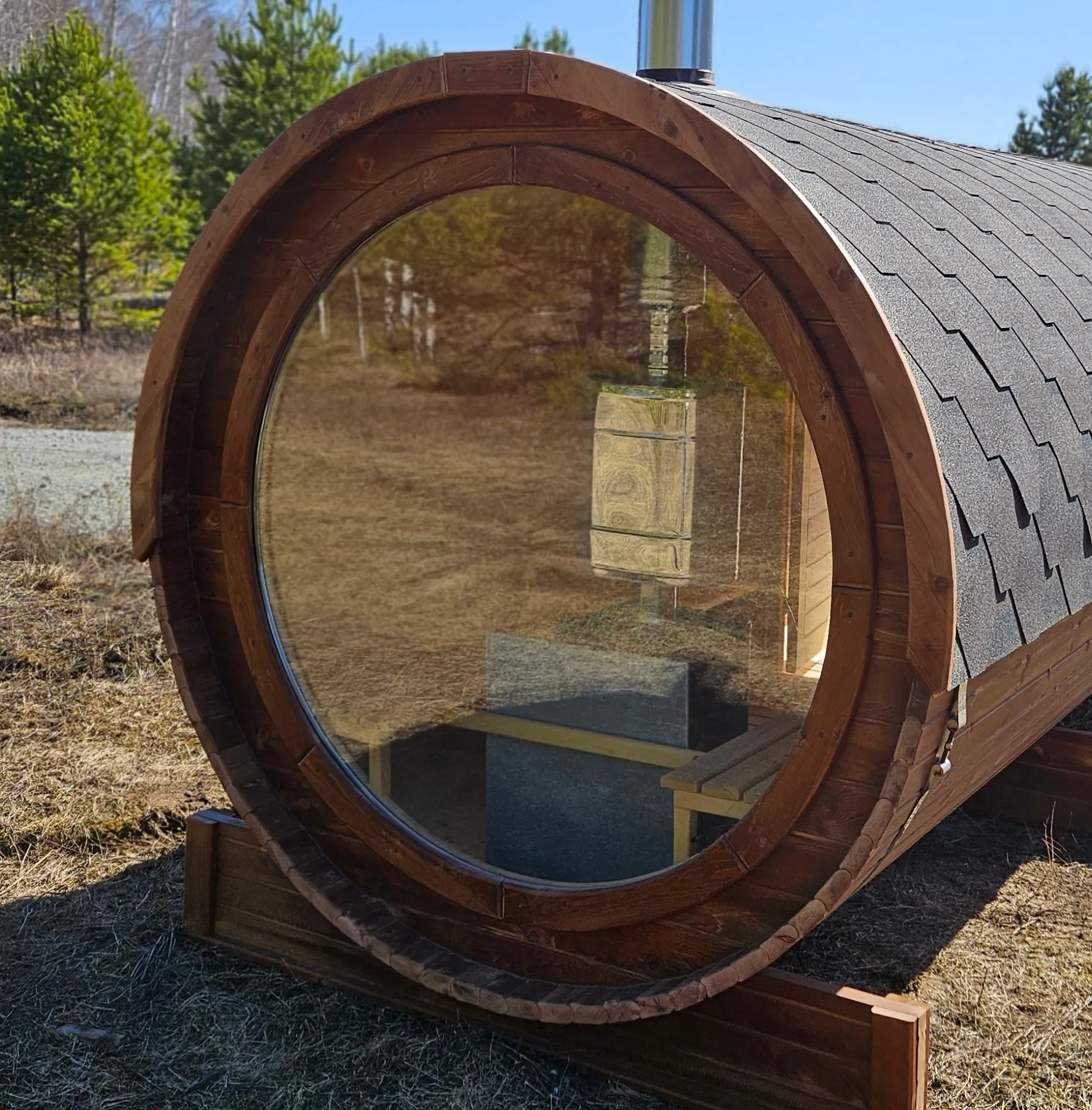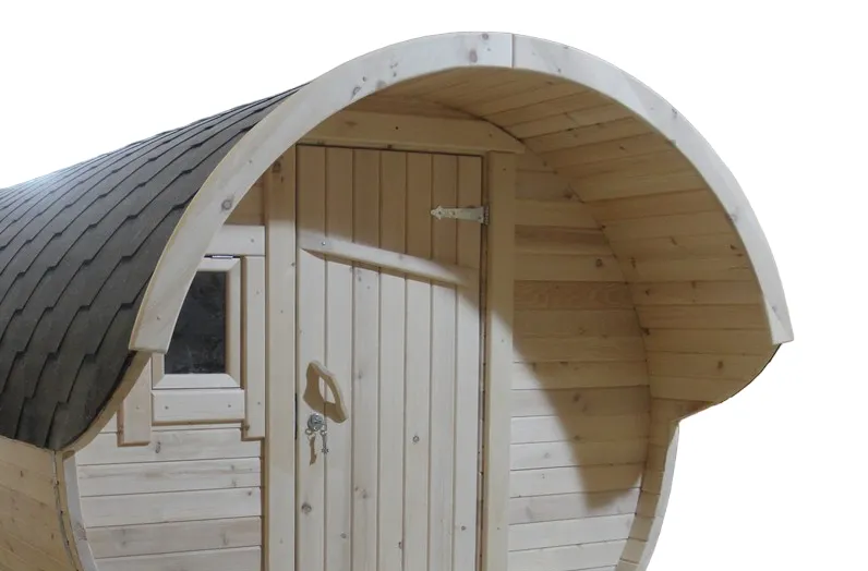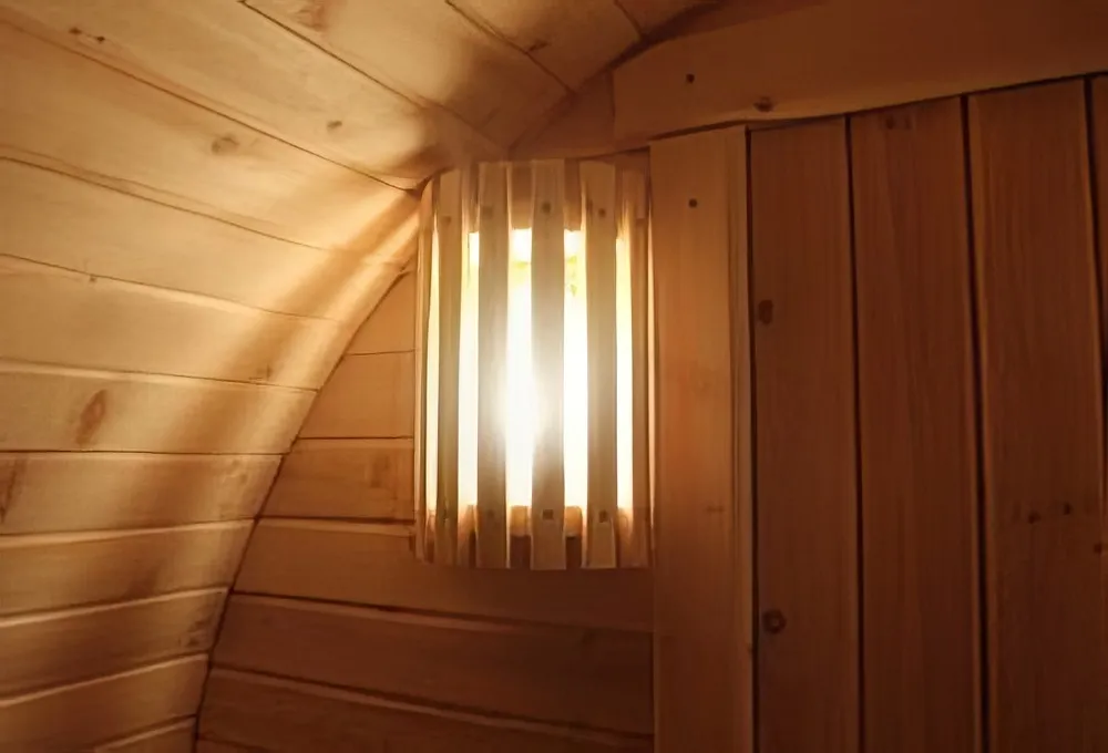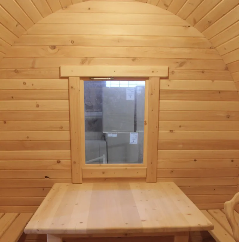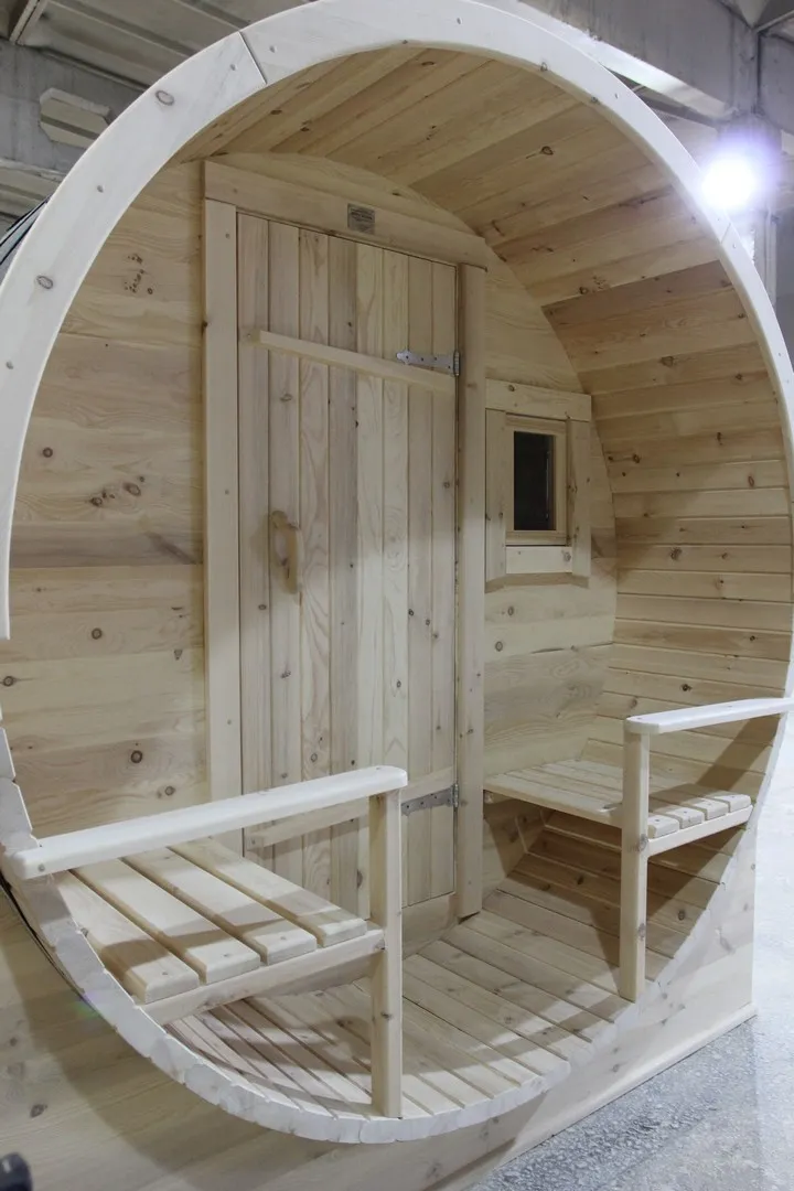 Это изделие круглой вытянутой формы с одним парильным отделением. Внутреннее пространство включает в себя печь у дальней стены и лавки из кедра по обе стороны бани. За счет компактной формы баня нагревается в течение 30 минут. По вашему желанию ее можно укомплектовать козырьком, верандой и печью с внешней загрузкой, благодаря которой весь мусор после топки остается на улице. Круглая баня-бочка не требует полноценный фундамент, поэтому при необходимости ее можно перенести в другое место.