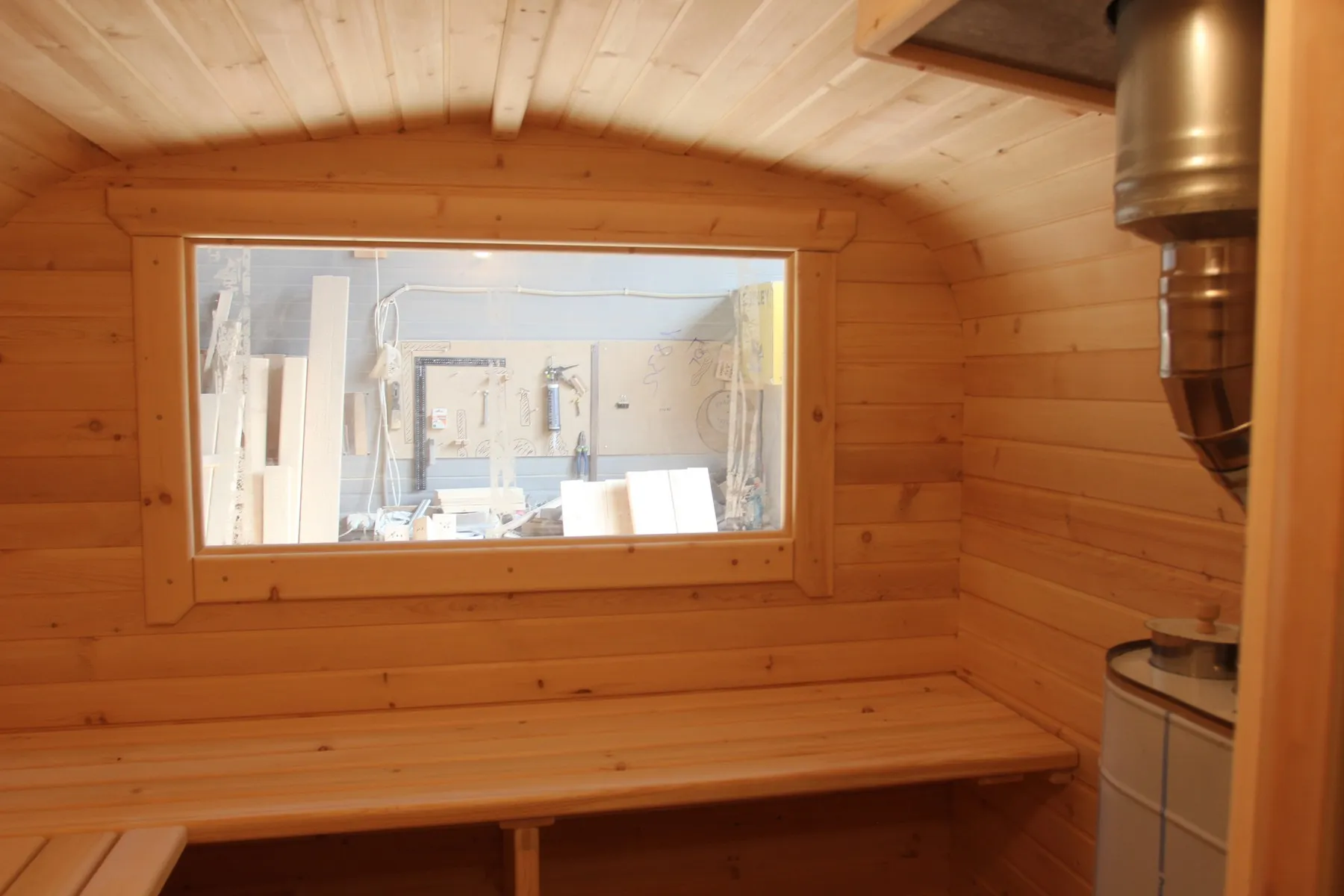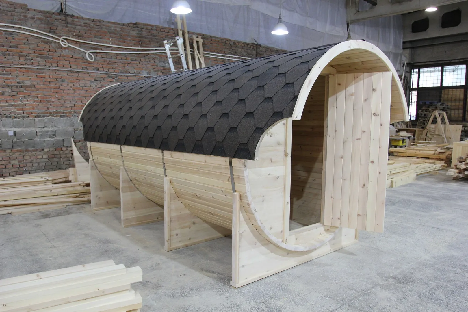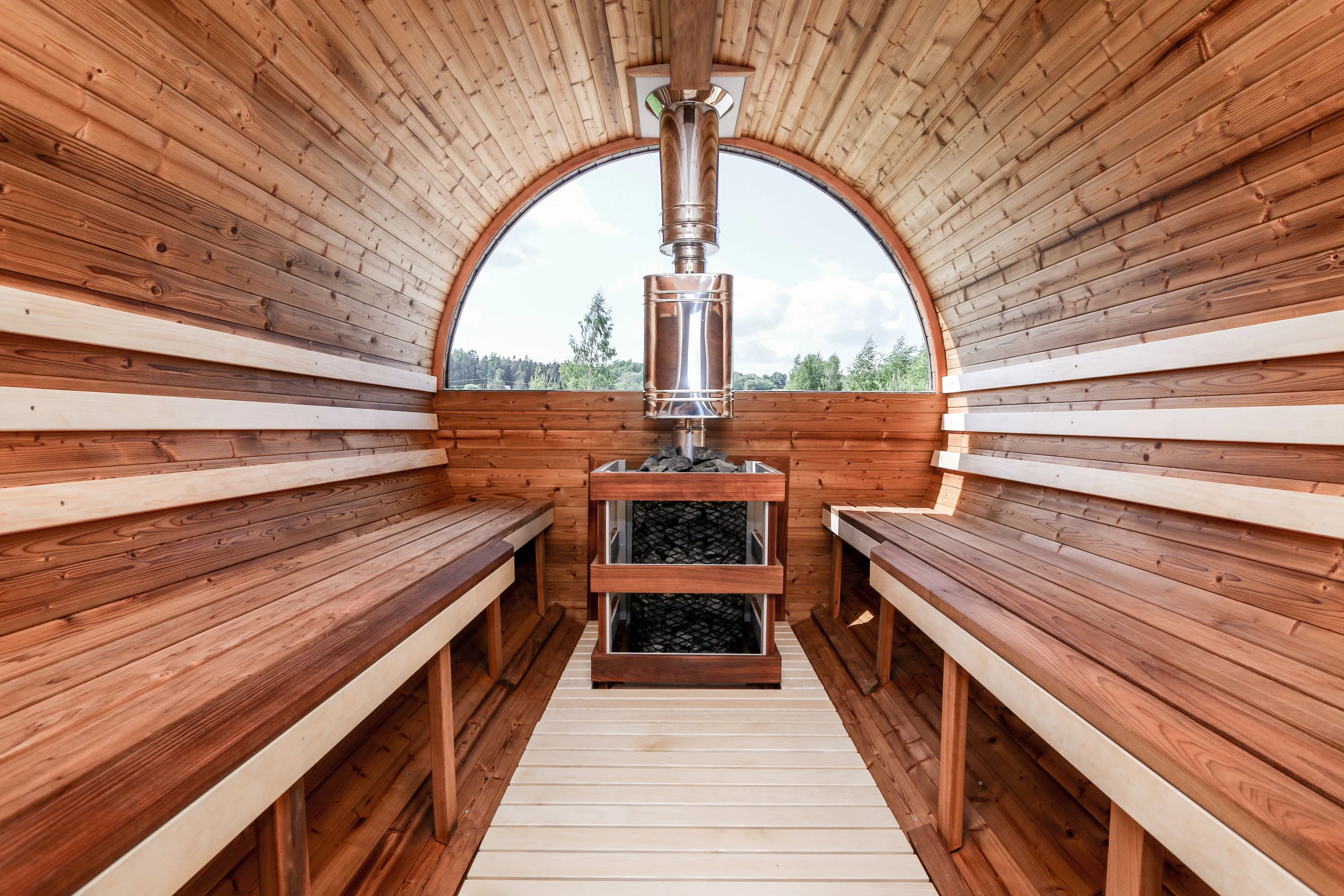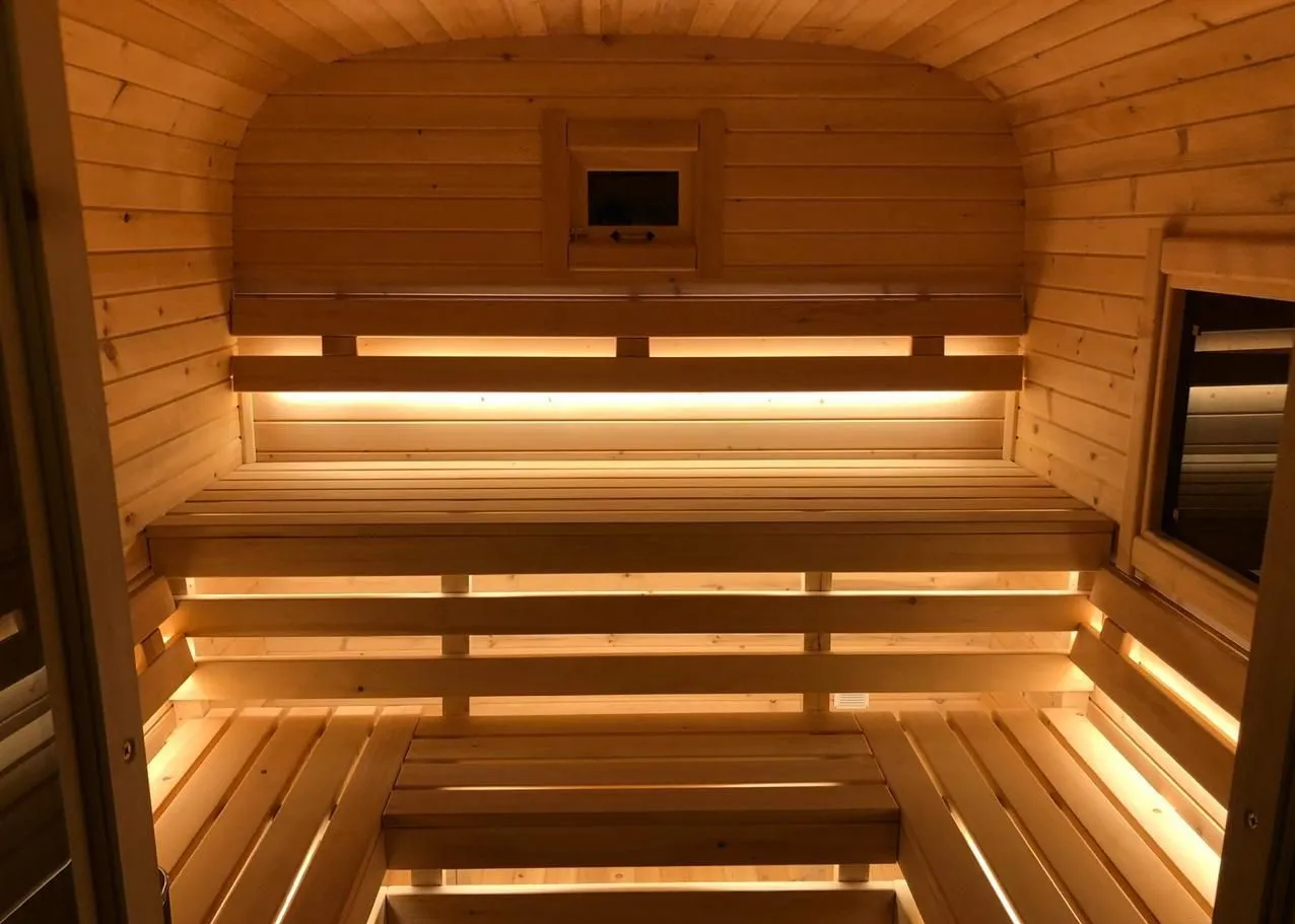 Это изделие круглой вытянутой формы с одним парильным отделением. Внутреннее пространство включает в себя печь у дальней стены и лавки из кедра по обе стороны бани. За счет компактной формы баня нагревается в течение 30 минут. По вашему желанию ее можно укомплектовать козырьком, верандой и печью с внешней загрузкой, благодаря которой весь мусор после топки остается на улице. Круглая баня-бочка не требует полноценный фундамент, поэтому при необходимости ее можно перенести в другое место.